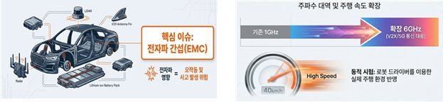 최근 전기차와 자율주행차 상용화가 가속화됨에 따라, 차량 내 탑재되는 수많은 전장품이 기기 간의 전자파 영향으로 오작동을 유발하여 안전사고를 일으킬 수 있어 EMC 기준 강화의 필요성이 대두되고 있다.