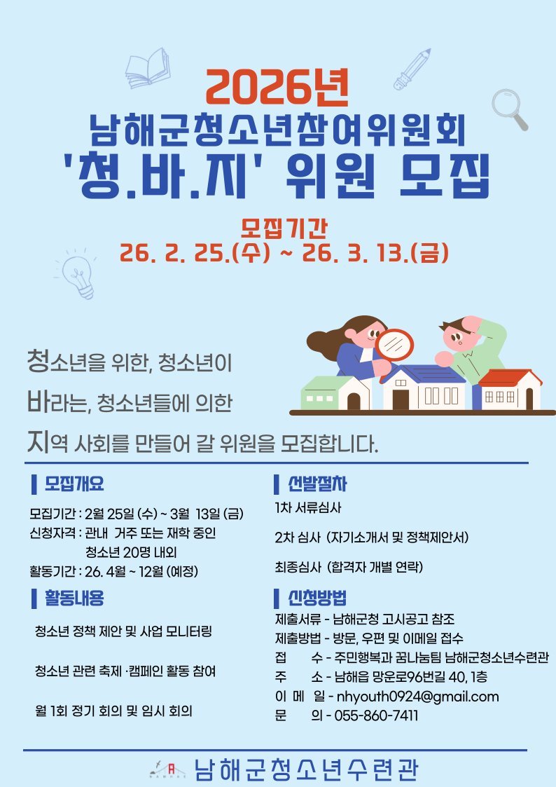 [아시아월드뉴스] 남해군은 2026년 지역 청소년 정책을 함께 만들어 갈 청소년참여위원회 신규 위원을 모집한다고 밝혔다.