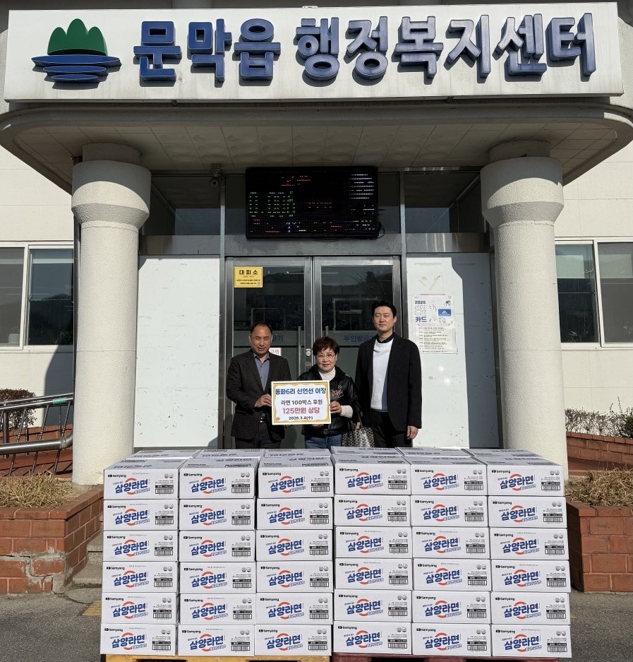 [아시아월드뉴스] 원주시 문막읍 동화6리 신언선 이장은 지난 4일 문막읍 행정복지센터를 방문해 문막읍지역사회보장협의체에 125만원 상당의 라면 100박스를 기탁했다.