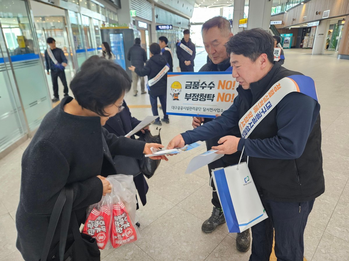 달서천사업처 직원들은 서대구역을 이용하는 시민들을 대상으로 ‘부정청탁 특혜제공 온정주의 No, Thank You’‘청렴한 대구, 깨끗한 대구, 안전한 대구, 대구공공시설관리공단이 앞장서겠습니다’등의 청렴 슬로건을 홍보했다.