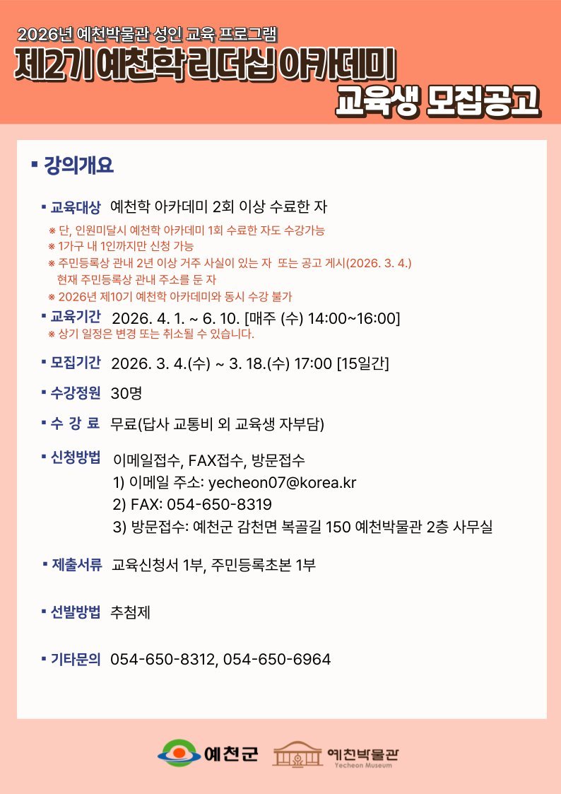 [아시아월드뉴스] 예천군은 2026년 상반기 ‘예천학 및 예천학 리더십 아카데미’교육생을 18일까지 모집한다.