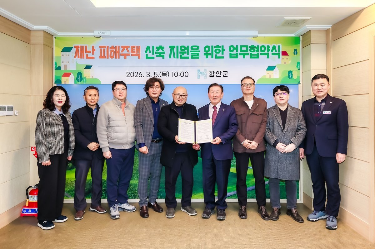 [아시아월드뉴스] 함안군은 지난 5일 군청 2층 군수실에서 재난으로 주택 피해를 입은 군민의 신속한 주거 안정과 일상 회복을 지원하기 위해 함안지역건축사회와 '재난 피해 주택 신축 지원을 위한 업무협약'을 체결했다고 밝혔다.