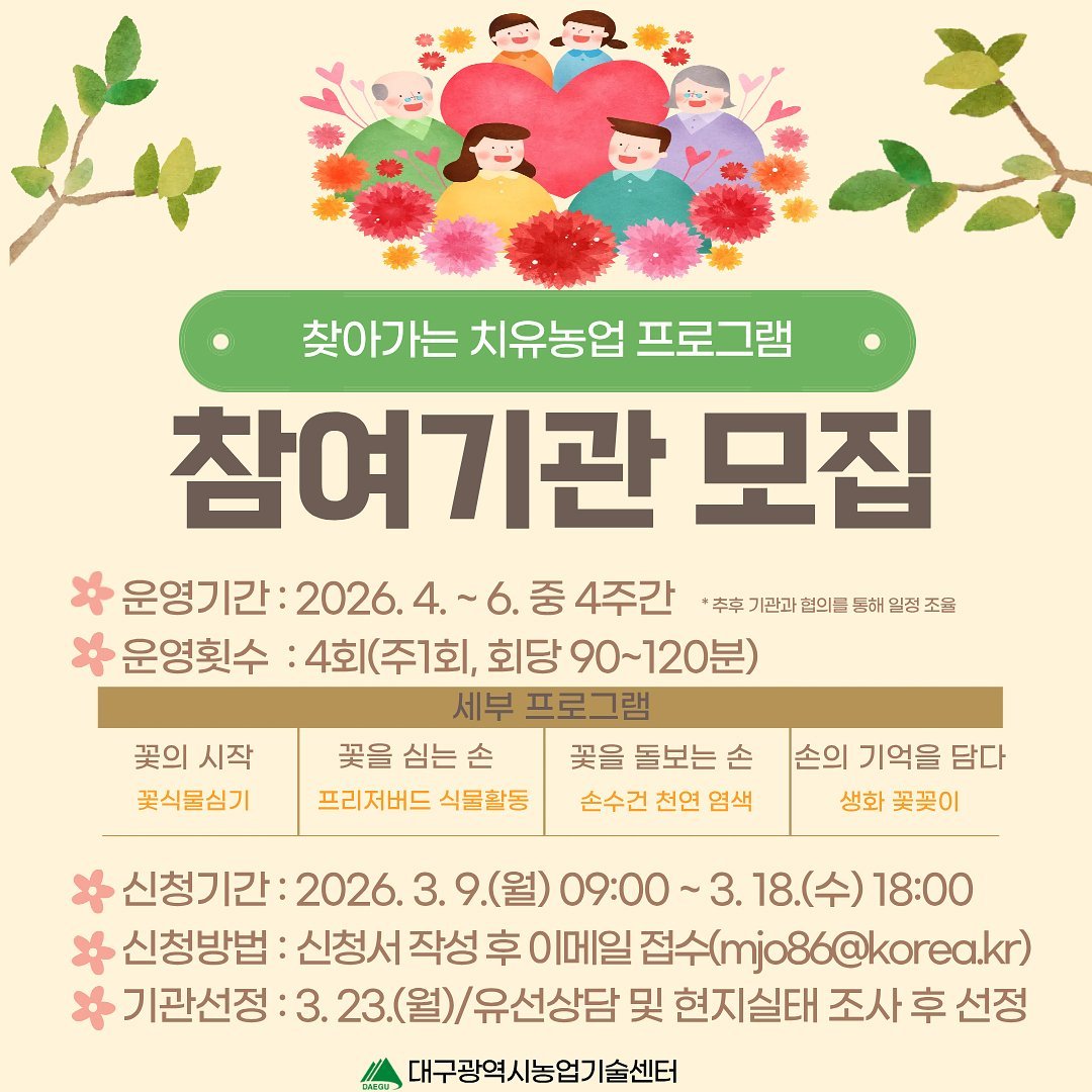 김수진 대구광역시농업기술센터 소장은 “치유농업은 농업의 공익적 가치를 바탕으로 시민의 정신 건강과 정서적 안정을 돕는 중요한 활동”이라며 “이번 프로그램을 통해 취약계층과 시민들이 자연 속에서 쉼과 회복의 시간을 경험하길 기대한다”고 말했다.
