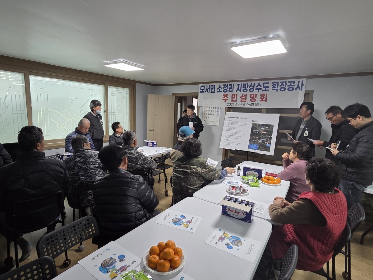 모서면 소정리 지방상수도 확장공사는 해당 지역 84가구에 깨끗하고 안정적인 수돗물을 공급하기 위한 사업으로 2025년 12월 착공해 2027년 12월 준공을 목표로 하고 있으며 총연장 5.55km의 관로와 배수지 1개소, 가압장 1개소 등을 설치할 계획이다.