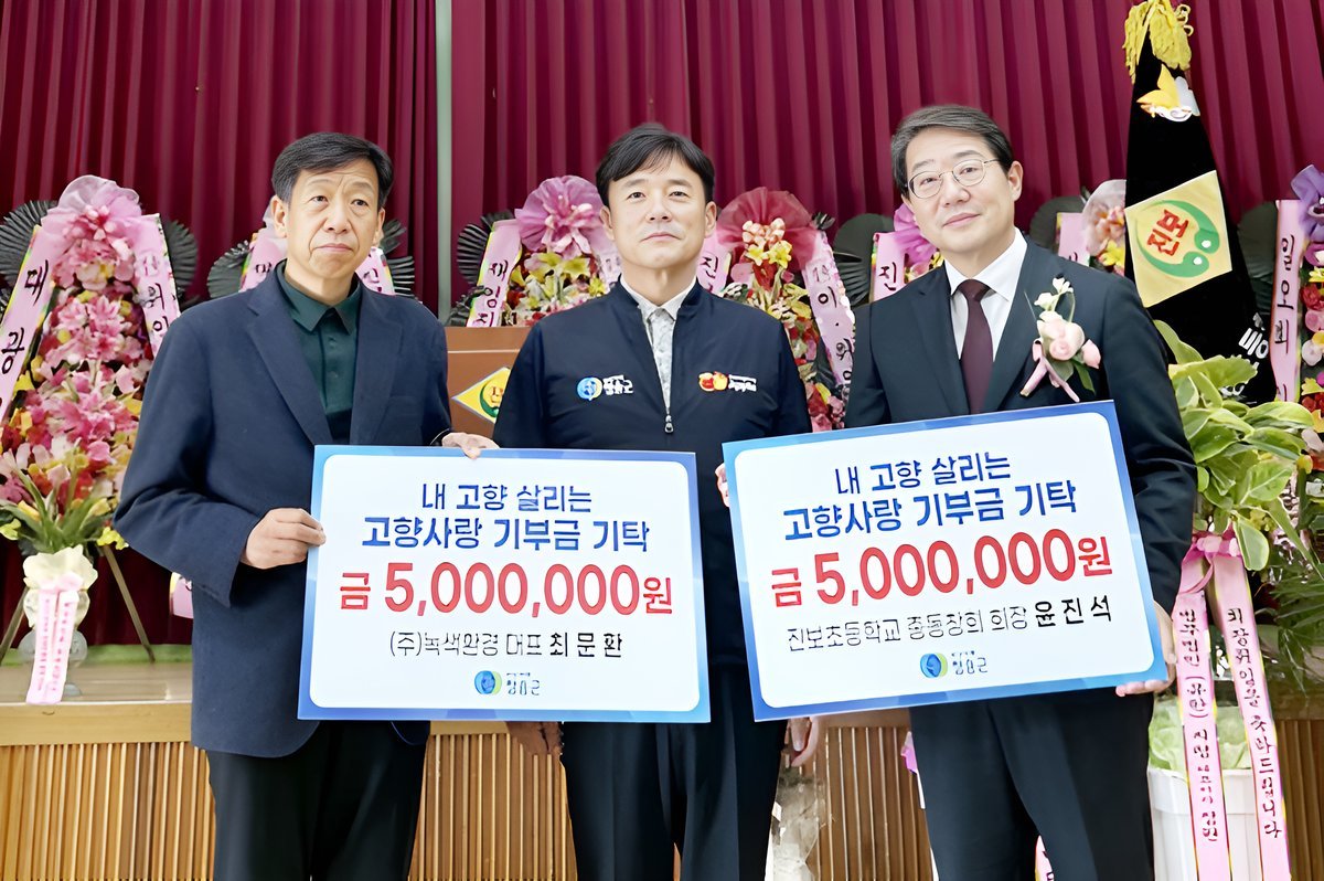 진보초등학교 총동창회장 윤진석 씨가 500만원을, 동문이자 녹색환경 대표 최문환 씨가 500만원을 각각 기탁해 총 1000만원의 고향사랑기부금을 전달했다.