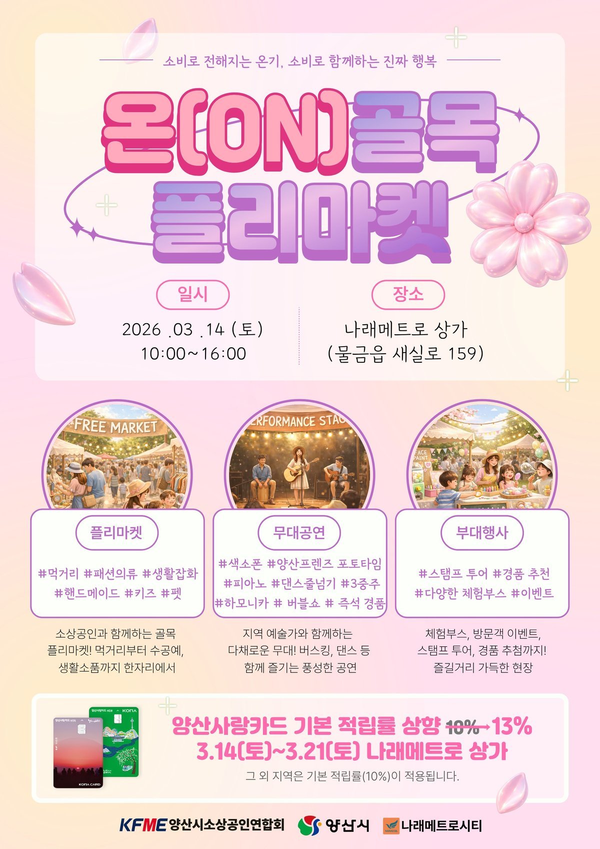 [아시아월드뉴스] 양산시 소상공인연합회에서 골목상권 활성화와 지역 상인들의 판로 확대를 위해‘온골목 플리마켓’을 3월 14일 나래메트로시티 상가, 3월 21일 덕계무지개상점가 인근 덕계2임시 공영주차장에서 개최한다고 밝혔다.