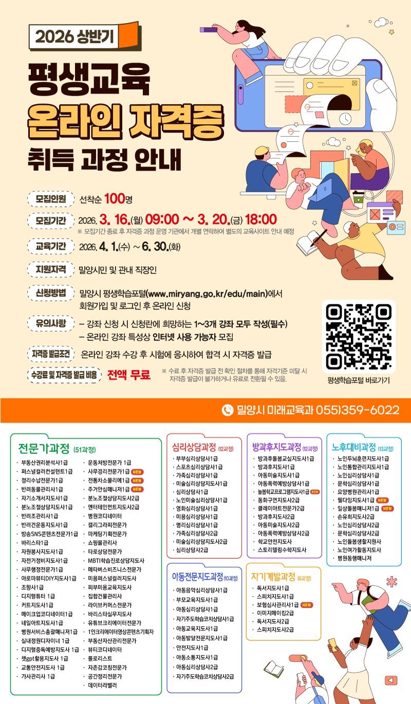 [아시아월드뉴스] 경남 밀양시는 시민의 직무역량 강화와 자기계발 지원을 위해 '2026년 상반기 평생교육 온라인 자격증 취득 과정'수강생을 오는 16일부터 모집한다.