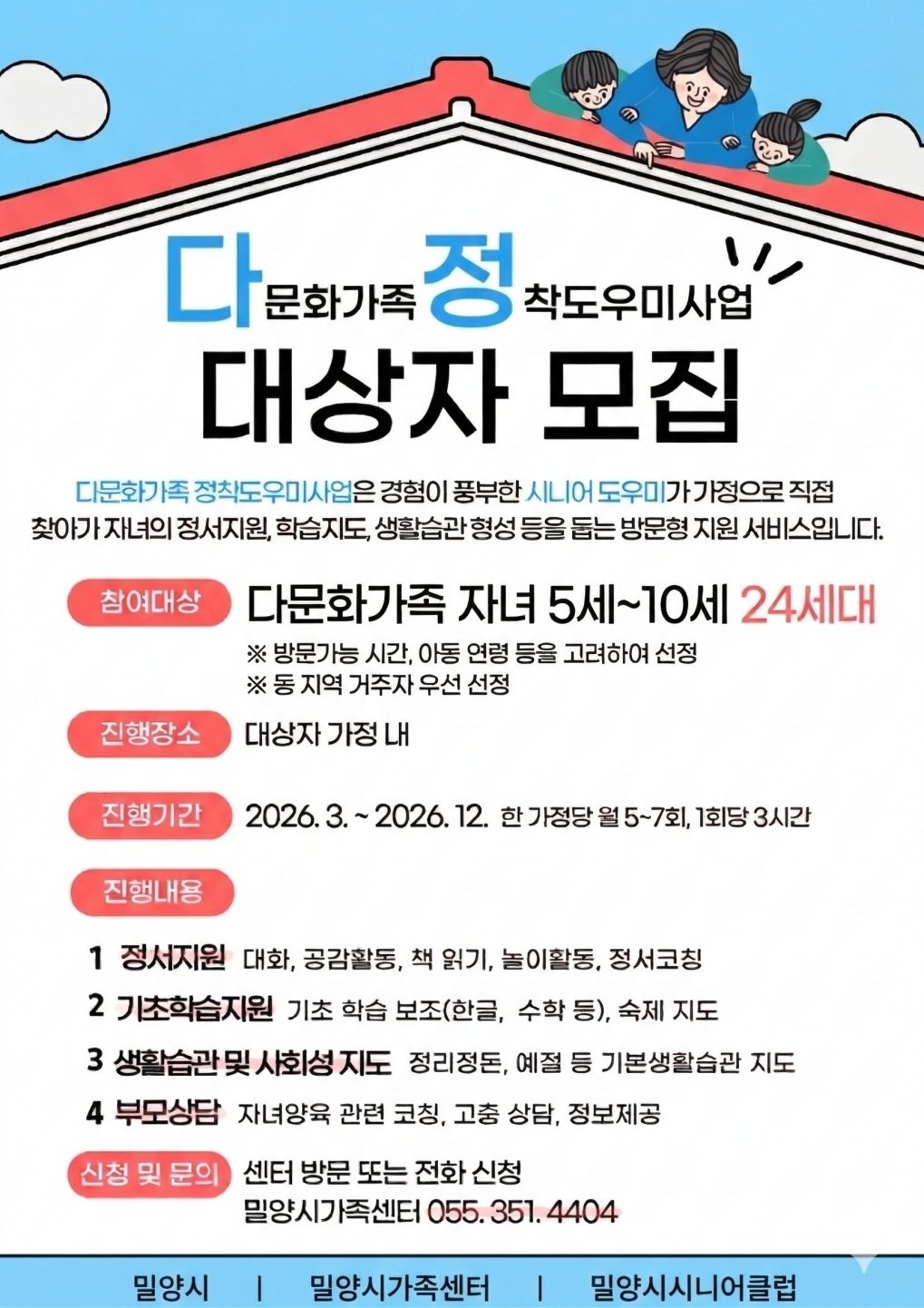 [아시아월드뉴스] 경남 밀양시는 언어 문화적 차이와 양육 정보 부족으로 어려움을 겪는 다문화가족의 안정적 정착을 돕기 위한 '다정사업'을 본격 추진한다고 9일 밝혔다.