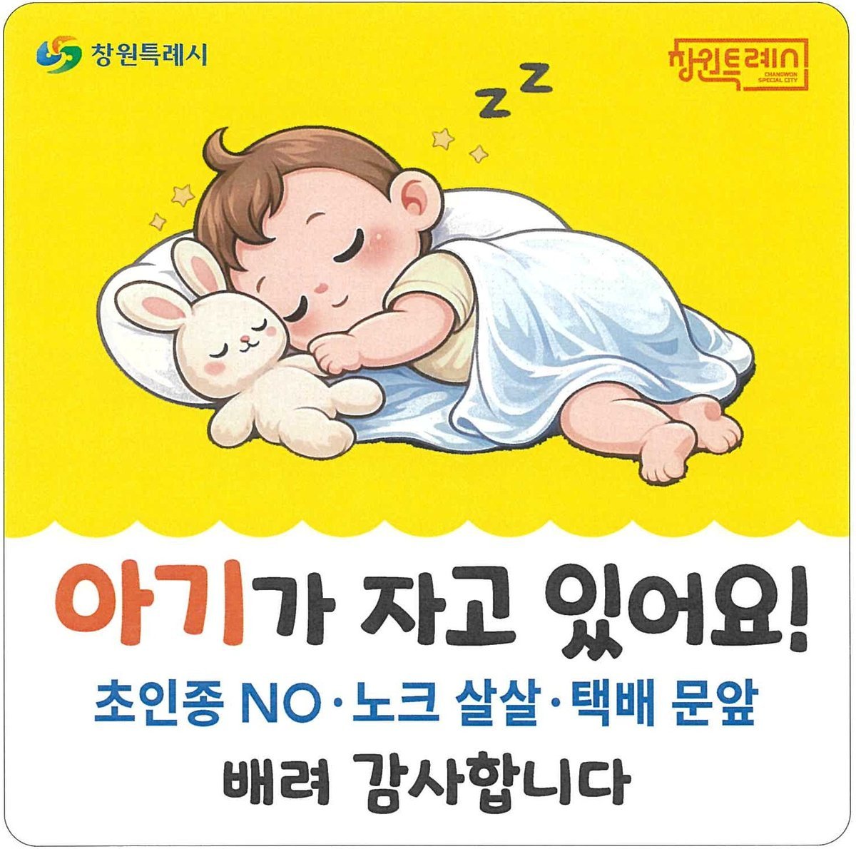 [아시아월드뉴스] 창원특례시는 2026년 출생신고를 하는 가정을 대상으로 '아기가 자고 있어요'현관문 자석 스티커를 제작해 무료로 배부한다고 10일 밝혔다.