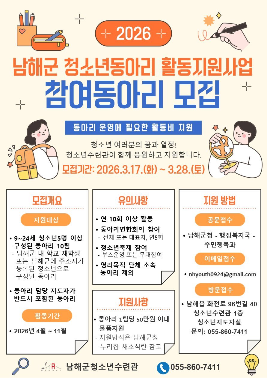 [아시아월드뉴스] 남해군청소년수련관이 ‘2026년 남해군 청소년동아리 활동지원사업’에 참여할 청소년동아리를 이달 28일까지 모집한다.