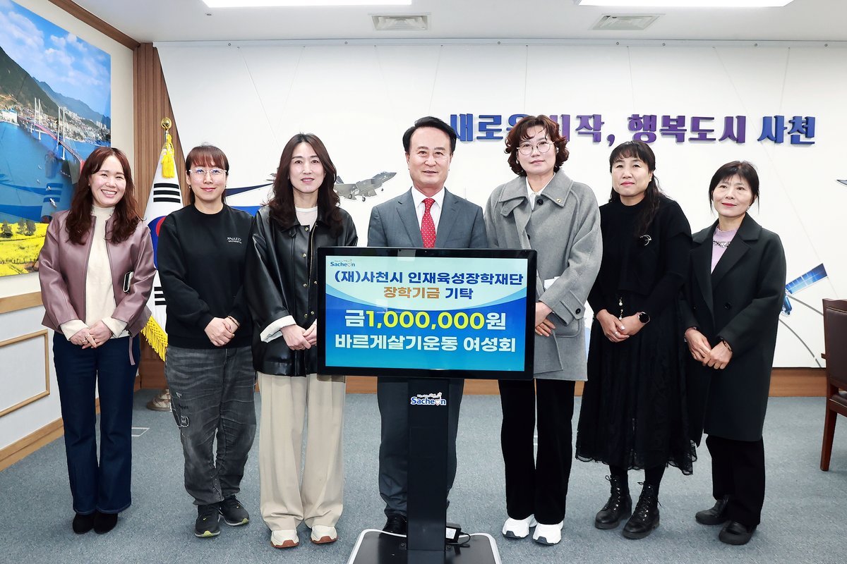시 관계자는 "항상 지역 사회를 위해 봉사와 나눔을 실천하고 계신 바르게살기운동 여성회 회원분들께 진심으로 감사드린다"며 "기탁해 주신 장학금은 사천의 학생들이 글로벌 인재로 성장할 수 있는 밑거름이 되도록 내실 있게 운영하겠다"고 밝혔다.