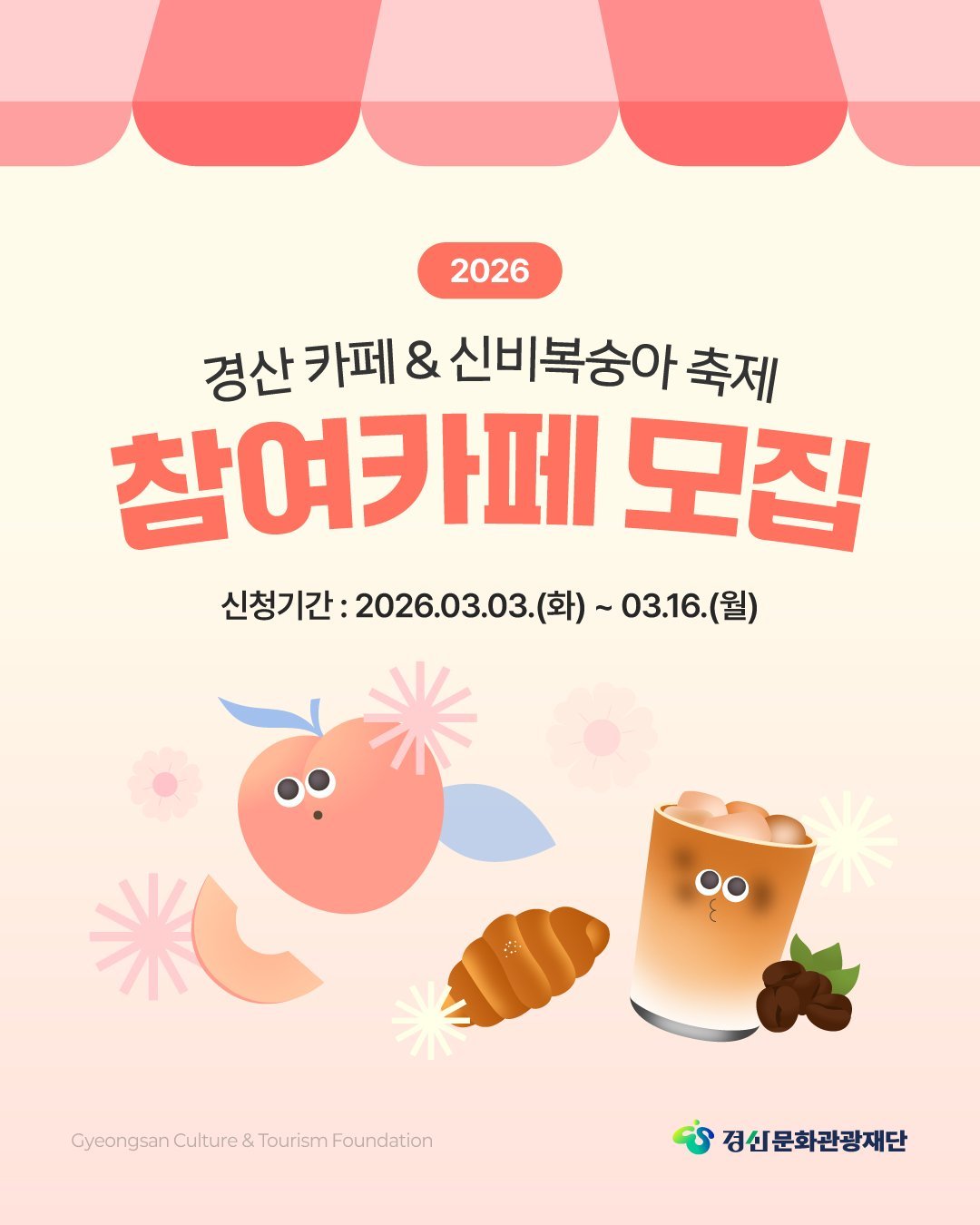 [아시아월드뉴스] 경산문화관광재단은 오는 6월 27일부터 7월 1일까지 개최되는 2026 경산 카페 신비복숭아 축제 를 함께 이끌어 갈 관내 참여 카페를 모집한다고 밝혔다.