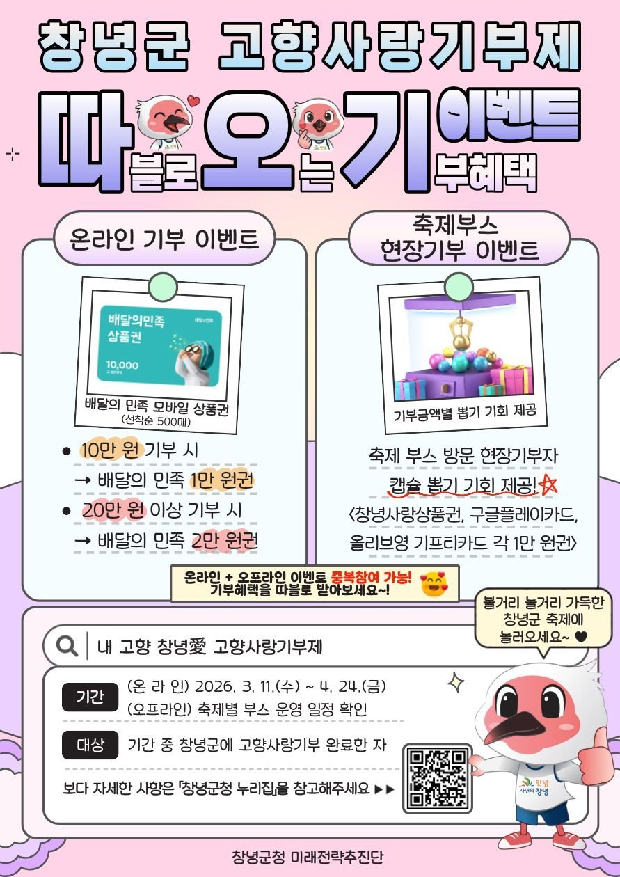 먼저 온라인 이벤트는 3월 11일부터 4월 24일까지 온라인으로 창녕군에 고향사랑기부를 한 기부자를 대상으로 10만원 기부 시 배달의민족 모바일 상품권 1만원권을, 20만원 이상 기부 시 2만원권을 추가로 증정한다.