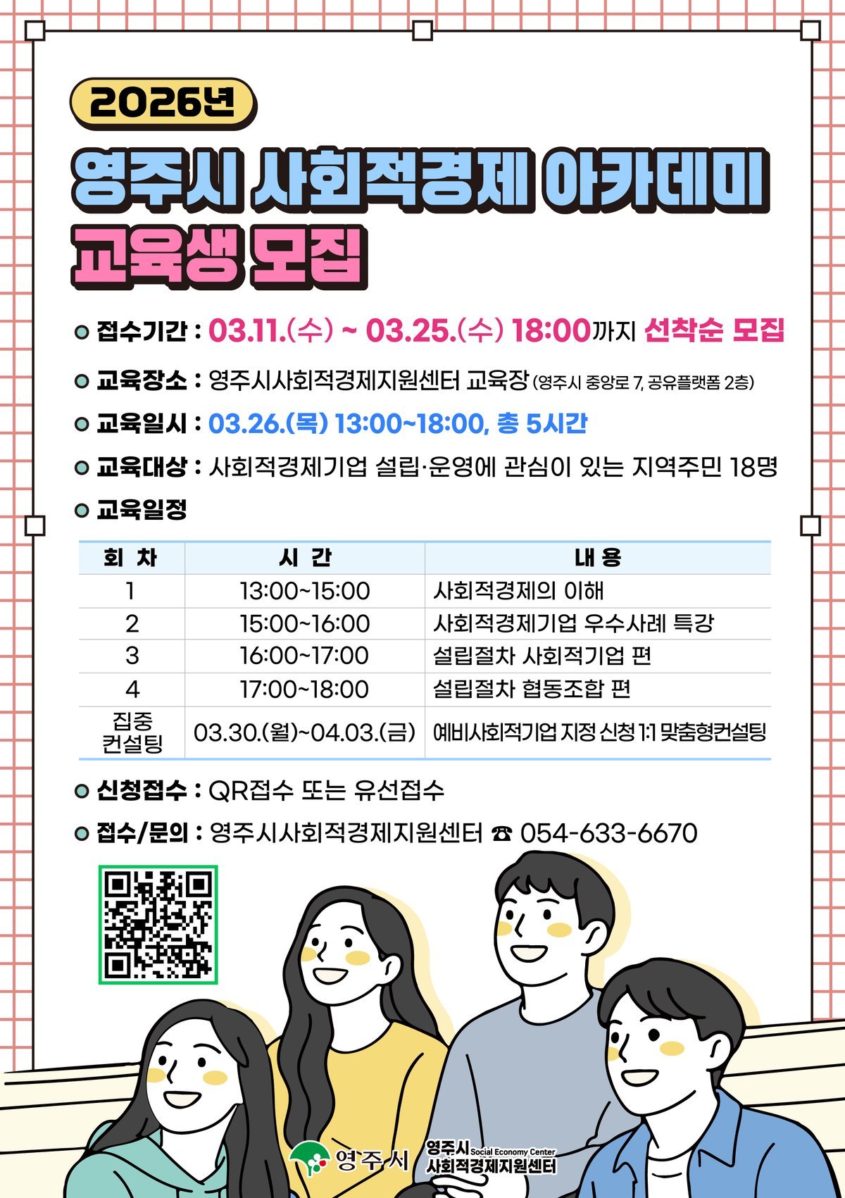 아카데미 모집과 관련한 자세한 사항은 영주시사회적경제지원센터 홈페이지에서 확인할 수 있으며 참여를 희망하는 경우 3월 25일까지 포스터 내 QR코드 또는 유선 신청을 통해 접수하면 된다.