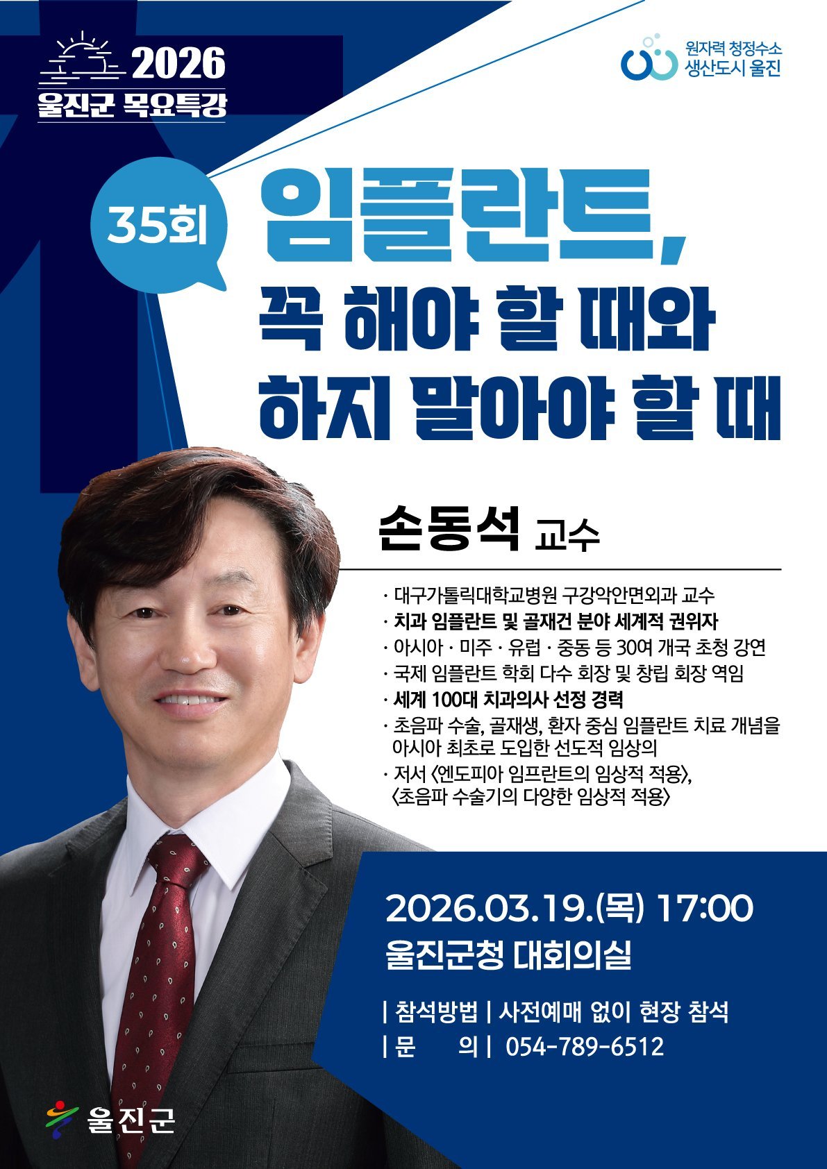 [아시아월드뉴스] 울진군은 오는 3월 19일 오후 5시 울진군청 대회의실에서 손동석 교수를 초청해‘임플란트, 꼭 해야 할 때와 하지 말아야 할 때’를 주제로 제35회이자 2026년 첫 목요특강을 개최한다.