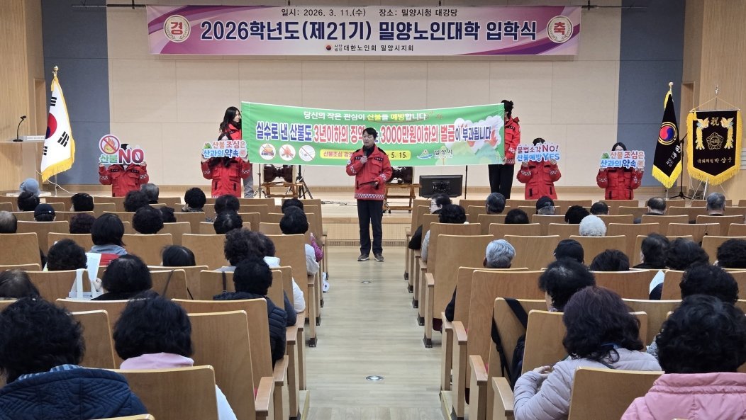 [아시아월드뉴스] 경남 밀양시는 11일 밀양시청 대강당에서 열린 '제21기 밀양노인대학 입학식'현장을 찾아 어르신 및 방문객을 대상으로 봄철 산불 예방 홍보활동을 펼쳤다.