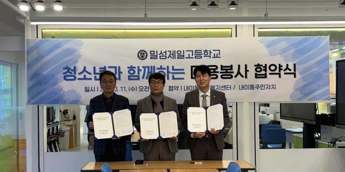 [아시아월드뉴스] 밀양시 내이동은 11일 밀성제일고등학교 헤어 디자인실에서 내이동 주민자치회, 밀성제일고등학교와 함께 '청소년과 함께하는 미용 봉사'운영을 위한 업무협약을 체결했다.