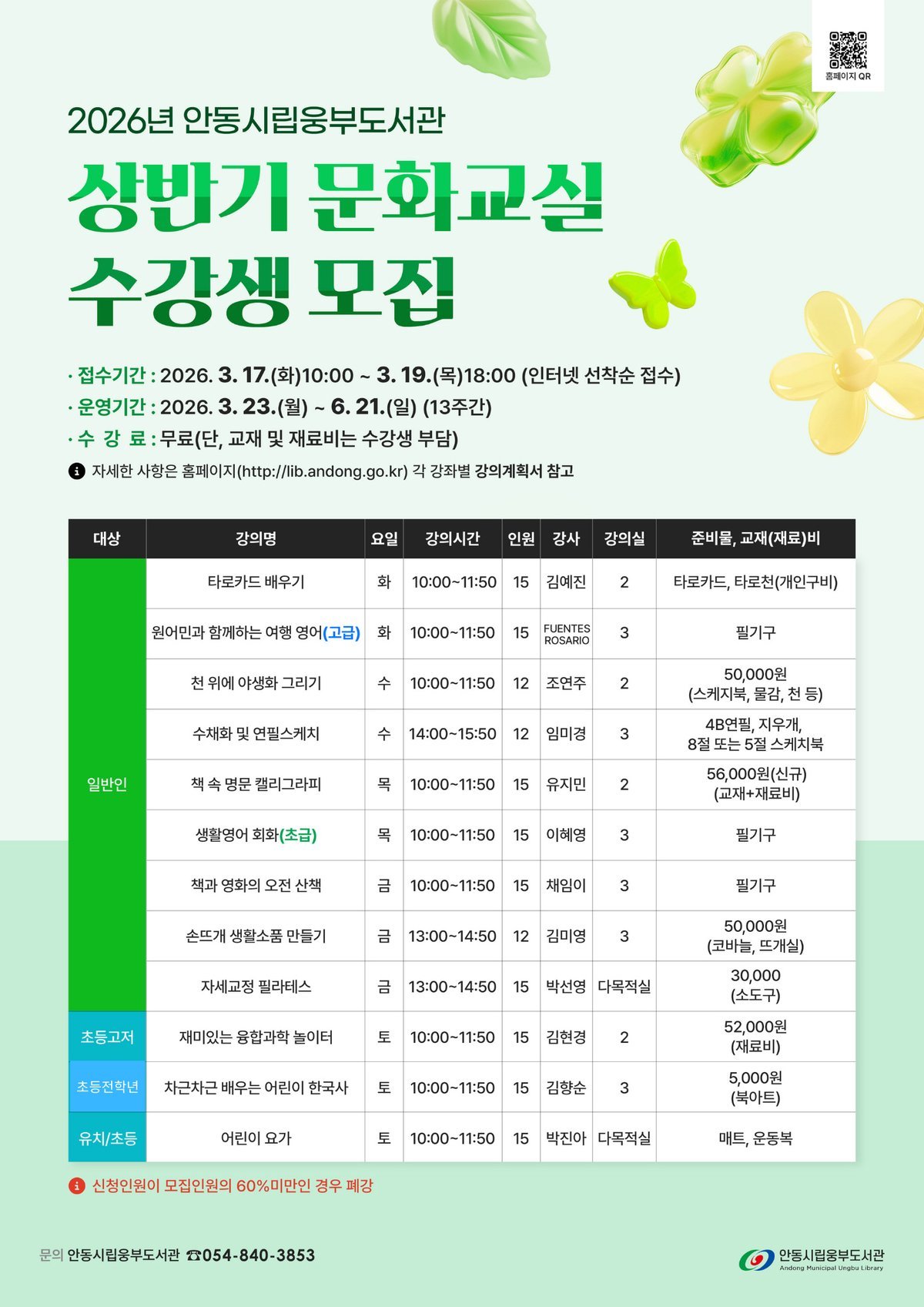[아시아월드뉴스] 안동시립웅부도서관이 오는 3월 17일부터 3월 19일까지 2026년 상반기 문화교실 수강생을 모집한다.