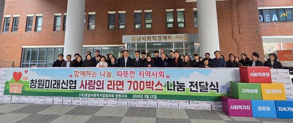 [아시아월드뉴스] 창원시특례시는 12일 경남사회적경제혁신타운 중앙광장에서 창원미래신협이 경남사회적기업협의회 창원지부에 관내 취약계층을 위한 라면 700박스 기탁 행사를 진행했다고 밝혔다.