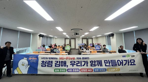 [아시아월드뉴스] 김해시는 12일 오후 2시 제2청사 중회의실에서 20개 문화예술단체와 함께 청렴한 김해 구현을 위한 '슬기로운 청렴생활 Hi-Five 약속 캠페인'을 실시했다.