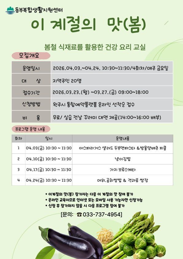 [아시아월드뉴스] 원주시 동부복합생활지원센터는 오는 23일부터 ‘이 계절의 맛 ’건강 요리 교실 프로그램 참여자를 모집한다.