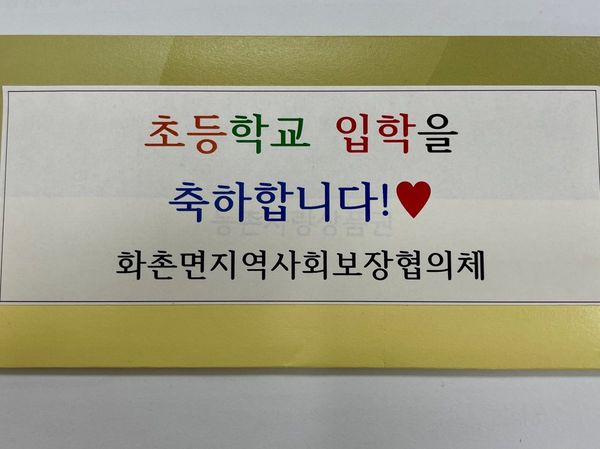 화촌면 지역사회 보장협의체는 3월 11일과 13일 이틀에 걸쳐 화촌면에서 취학통지서를 받은 초등학교 입학생 3명의 학부모에게 각 25만원 상당의 홍천사랑상품권을 전달했다.