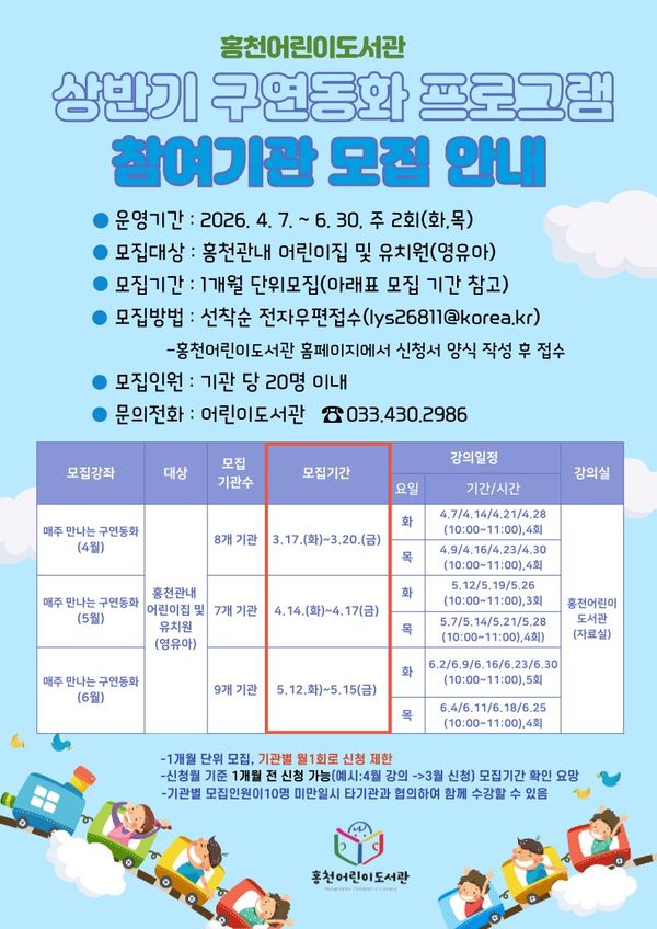 [아시아월드뉴스] 홍천군은 영유아에게 그림책을 통해 정서적 안정 및 사회성 향상에 도움을 주며 책과 도서관을 가까이할 기회 제공을 위한 2026년 상반기 홍천 어린이도서관 매주 만나는 구연동화 프로그램 참여기관을 모집한다.