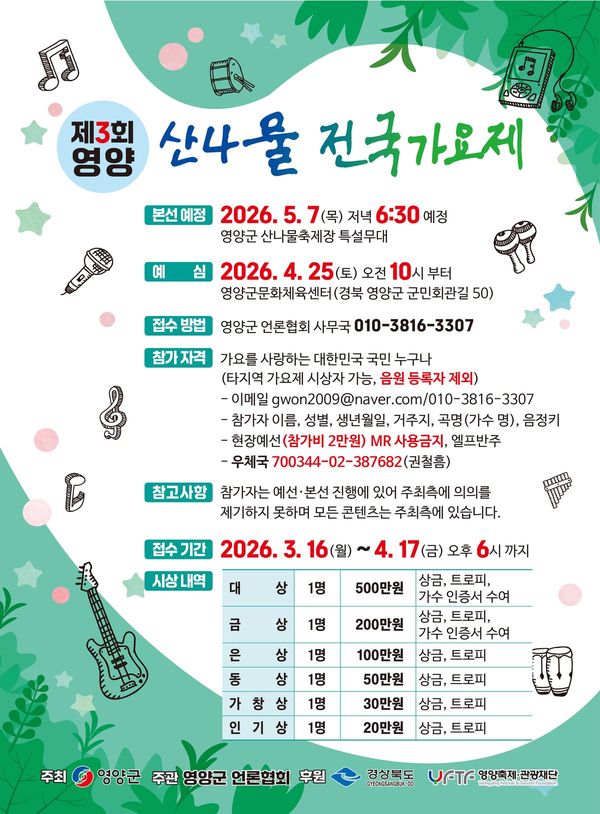 "영양의 문화와 전통 알리는 축제의 장 될 것"오도창 영양군수는 "올해로 3회째를 맞는 이번 가요제가 신인 가수들의 꿈을 이루는 통로이자, 영양의 풍성한 문화와 전통을 널리 알리는 계기가 되길 바란다"며 "주관사인 영양군언론협회와 협력해 내실 있고 탄탄한 행사를 준비하겠다"고 밝혔다.