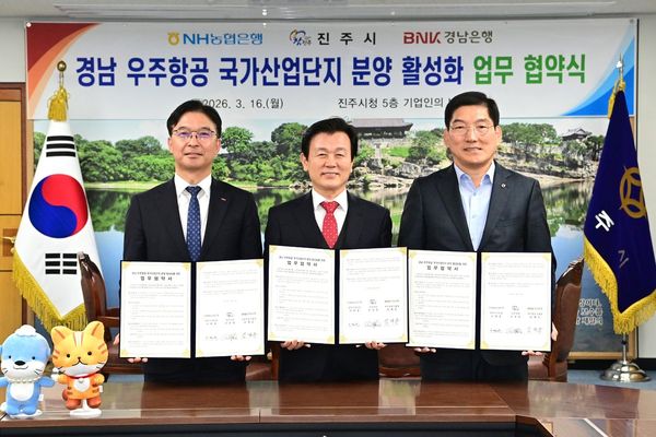[아시아월드뉴스] 진주시는 16일 시청 기업인의 방에서 NH농협은행, BNK경남은행과 '경남 우주항공 국가산업단지 분양 활성화'를 위한 업무협약을 체결했다고 밝혔다.