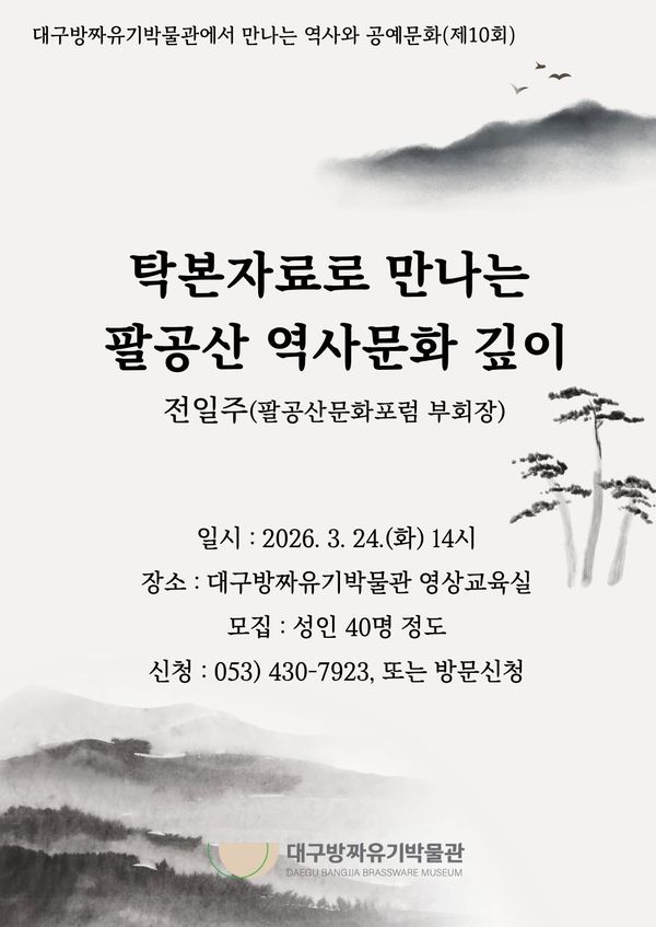 [아시아월드뉴스] 대구문화예술진흥원 박물관운영본부 소속 대구방짜유기박물관은 봄날에 팔공산 역사문화 특강과 국악 공연을 기획해 3월 24일 오후 2시에 ‘탁본자료로 만나는 팔공산 역사문화 깊이’를, 4월 7일 오후 1시에 대구시립국악단 찾아가는 공연 ‘봄날의 풍류’를 개최한다.