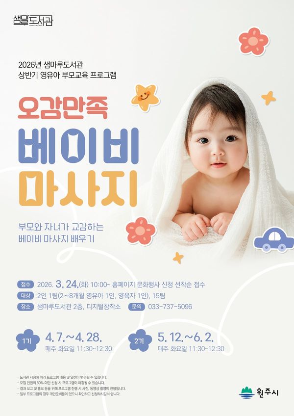 [아시아월드뉴스] 원주시 샘마루도서관은 오는 4월부터 영유아 부모교육 활동 지원을 위해 ‘오감 만족 베이비 마사지 프로그램’을 운영한다.