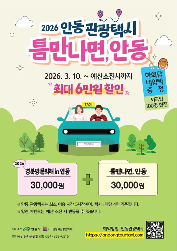 특히 3월 10일부터 예산 소진 시까지 진행되는 ‘틈만나면, 안동’캠페인 기간과 사계절 축제 기간에는 추가로 3만원이 할인돼 이용객은 최대 6만원까지 요금 할인을 받을 수 있다.
