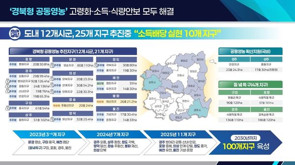 그 외에도 경북형 공동영농의 대표 모델인 문경 영순지구는 배당 3년 차에 접어들었으며 구미 웅곡지구와 영덕 달산지구가 2년 차, 의성 단북지구를 비롯한 7개 지구가 첫 배당을 실시했다.