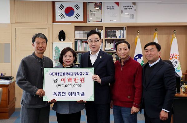 하동군장학재단은 지난 16일 위태마을 최정선 이장과 이준철 총무, 주민 양호정 씨가 군수 집무실을 방문해 지역 학생들의 학업 지원과 인재 육성을 위한 장학기금 200만원을 전달했다고 밝혔다.