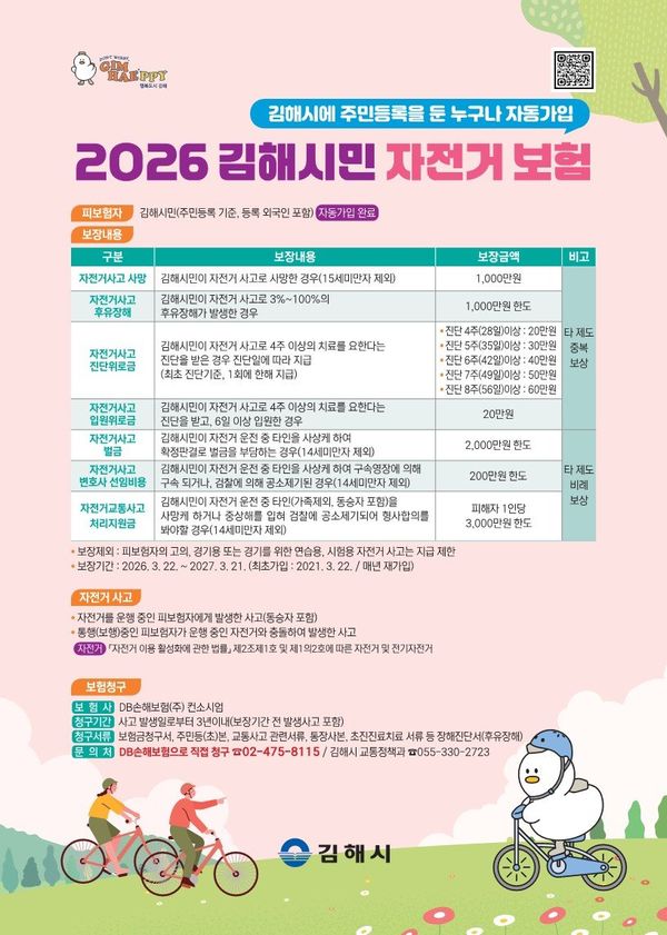 [아시아월드뉴스] 김해시가 지난 2월 25일부터 2027년 2월 24일까지 적용되는 시민안전보험의 보장 항목과 한도를 대폭 확대했다고 17일 밝혔다.