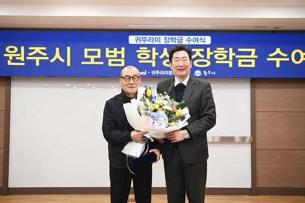 [아시아월드뉴스] 원주시는 17일 오전 10시, 시청 지하 1층 다목적홀에서 귀뚜라미문화재단 장학금 및 장학증서 수여식을 개최하고 예체능 분야에서 재능과 성장 가능성을 보인 지역 중 고등학생 50명에게 장학금을 전달했다.