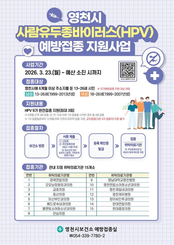 [아시아월드뉴스] 영천시는 오는 23일부터 영천시에 6개월 이상 주소지를 둔 13~26세 시민을 대상으로 사람유두종바이러스 예방접종을 확대 시행한다고 밝혔다.