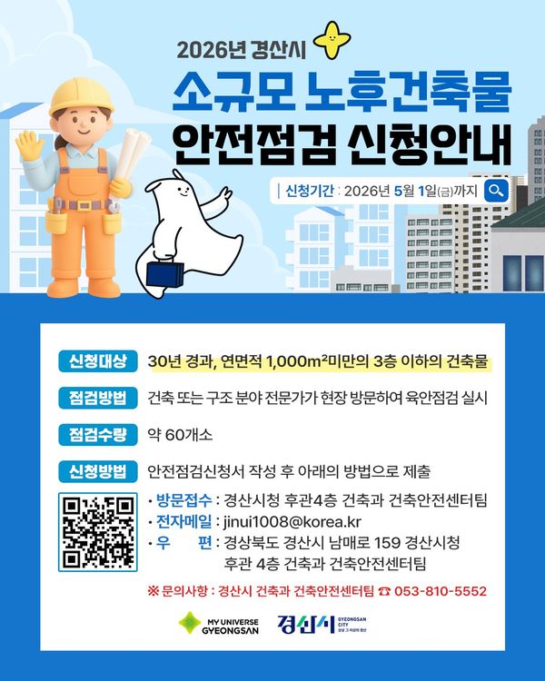 [아시아월드뉴스] 경산시는 법적으로 안전 점검 의무가 없는 소규모 노후 건축물을 대상으로 건축 전문가가 참여한 안전 점검을 추진, 이달 16일부터 5월 1일까지 신청자를 모집한다.