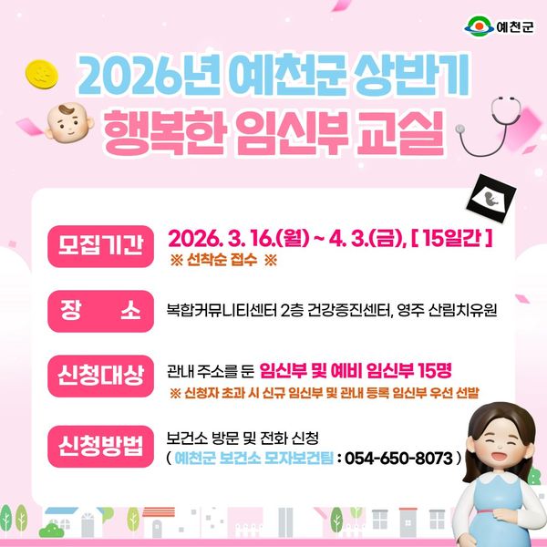 [아시아월드뉴스] 예천군은 관내 임신부 및 예비 임신부를 대상으로 '2026년 상반기 행복한 임신부 교실'을 운영한다.