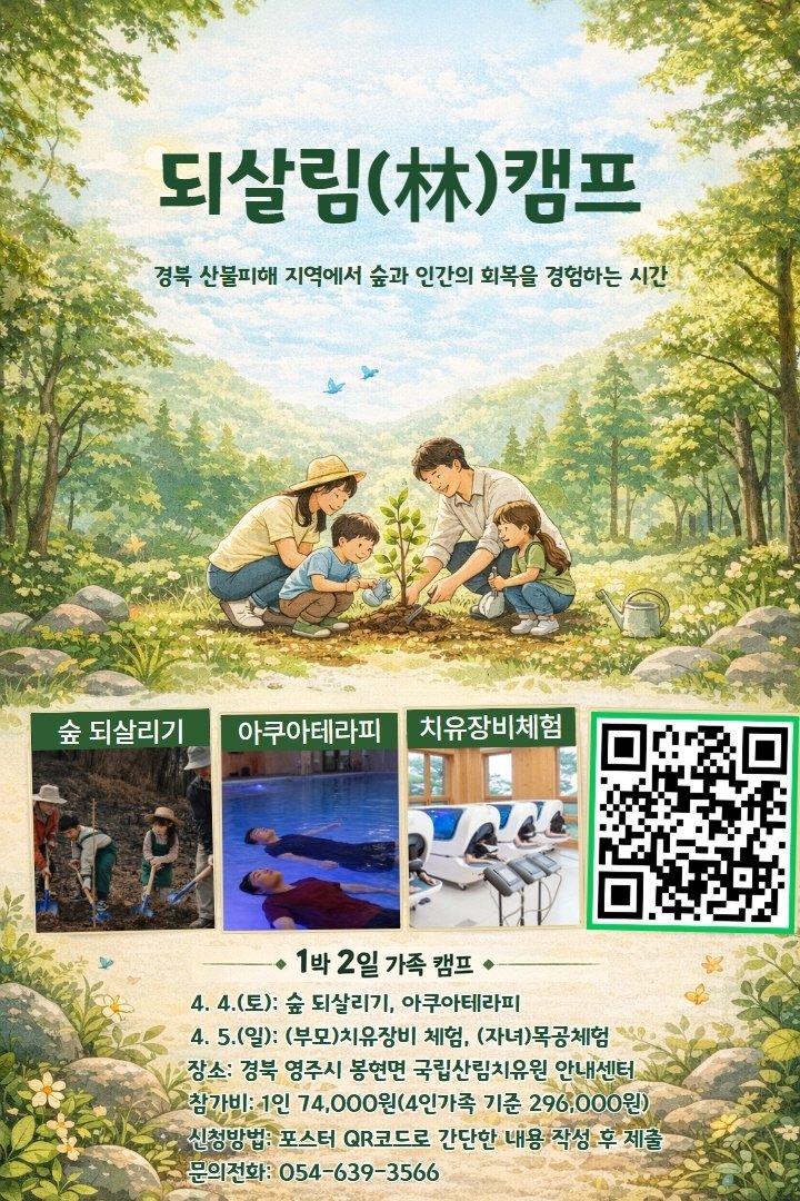 [아시아월드뉴스] 산림청 한국산림복지진흥원은 지난해 화마가 휩쓸고 간 경북 산불 피해지역에서 복구 활동에 직접 참여하고 산림치유를 통해 피로까지 회복하는 ‘되살림 캠프’참가자를 오는 31일까지 모집한다고 밝혔다.