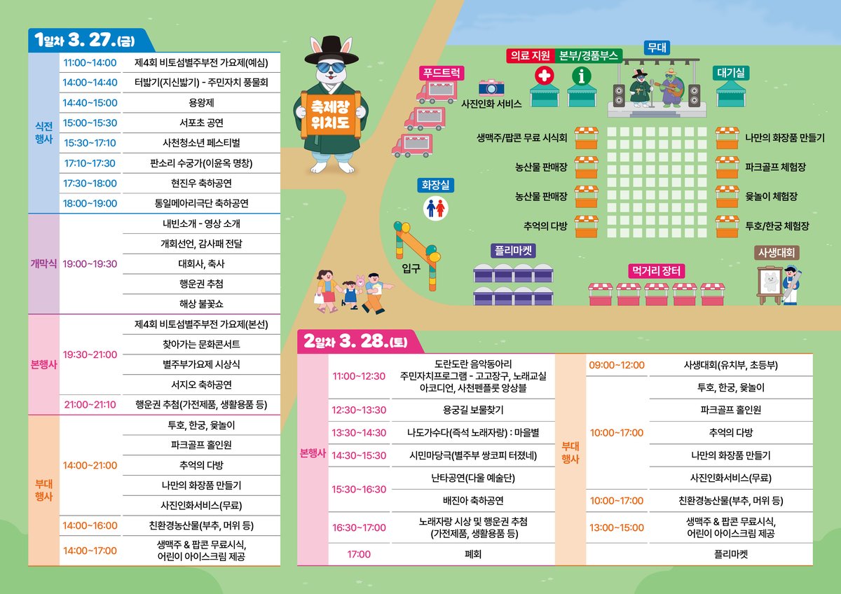 최현철 위원장은 "제11회 사천비토섬 별주부전 축제를 통해 시민과 관광객 모두가 행복한 추억을 만들 수 있도록 정성껏 준비하고 있다"며 "아름다운 봄날 바다 풍경이 어우러진 비토섬 많이 방문하셔서 즐거운 시간을 보내시길 바란다"고 말했다.