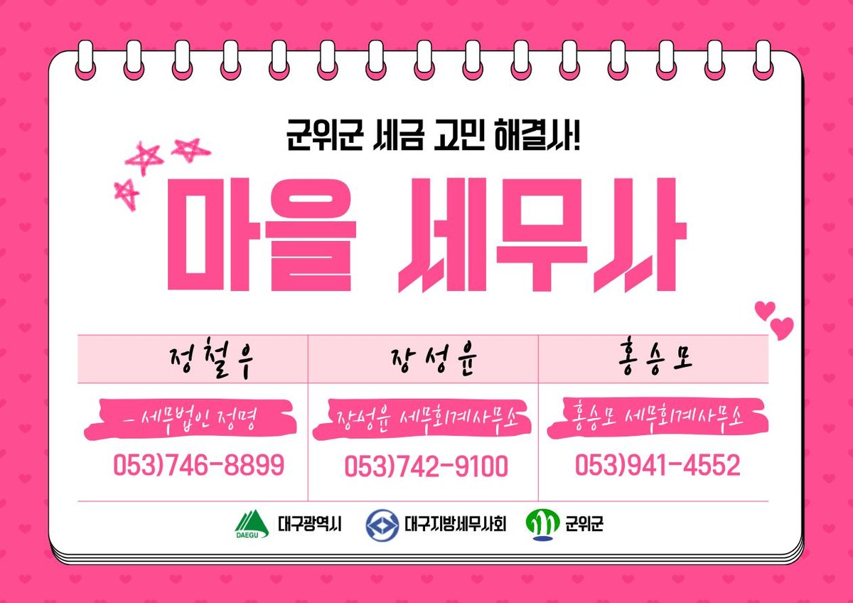 군위군 재무과장은 “마을세무사 제도는 세금 문제로 어려움을 겪는 군민들에게 실질적인 도움을 주는 제도”며 “앞으로도 군민들이 편리하게 상담 서비스를 이용할 수 있도록 제도 홍보와 운영에 최선을 다하겠다”고 말했다.