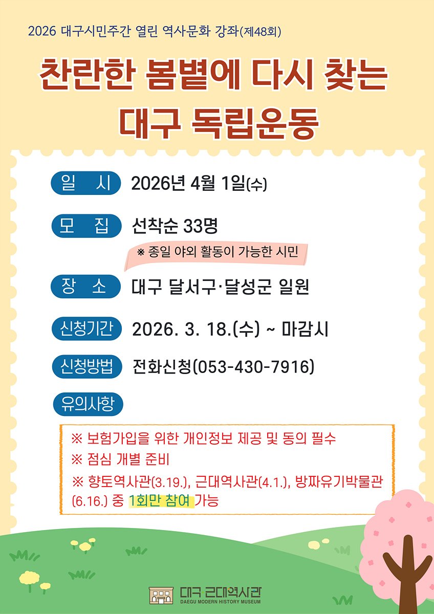 [아시아월드뉴스] 대구문화예술진흥원 박물관운영본부 소속 대구근대역사관은 2026 대구시민주간 연계행사로 4월 1일 대구시 달서구와 달성군 일원의 대구 독립운동가와 문화유산을 찾아보는 ‘찬란한 봄볕에 다시 찾는 대구 독립운동’답사를 개최하며 참가자를 모집한다.