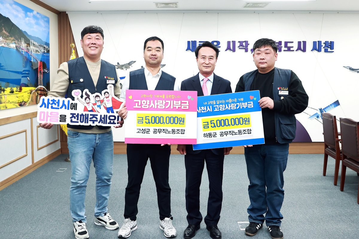 [아시아월드뉴스] 사천시 고성군 하동군 공무직노동조합이 19일 사천시청을 방문해 각 지부별로 500만원씩, 총 1000만원의 기부금을 전달하며 돈독한 우정을 다시 한번 확인했다.