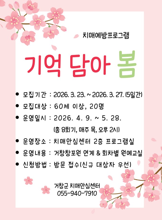 [아시아월드뉴스] 거창군 치매안심센터는 오는 23일부터 27일까지 5일간 지역주민의 인지 건강과 치매 예방을 위해 상반기 치매예방교실 기억 담아 봄 참여자를 모집한다.