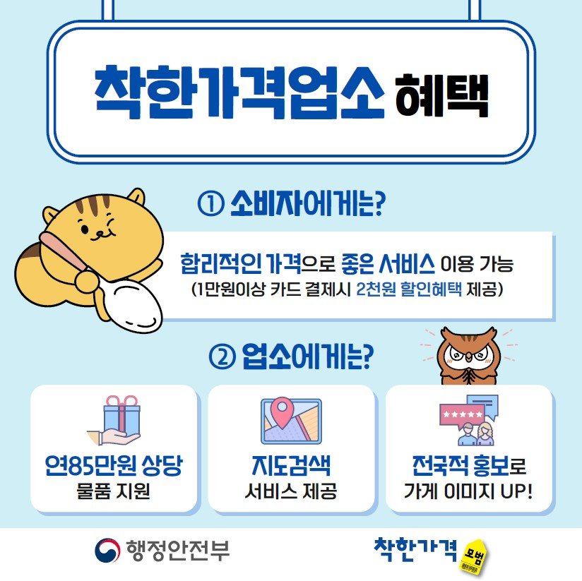 행정안전부가 주관하는 '착한가격업소를 찾습니다', '착한가격업소 방문 인증 챌린지'등에 참여하면 선착순으로 기념품을 증정하며 카드사별 할인 등 다양한 혜택도 제공된다.
