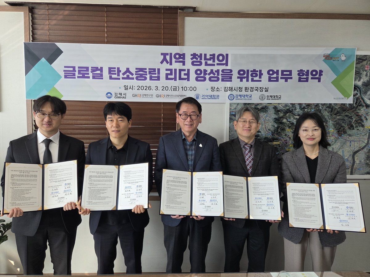 [아시아월드뉴스] 김해시는 20일 시청 환경국장실에서 김해연구원, 가야대학교, 김해대학교, 인제대학교와 함께 '지역 청년의 글로컬 탄소중립 리더 양성을 위한 업무협약'을 체결했다.