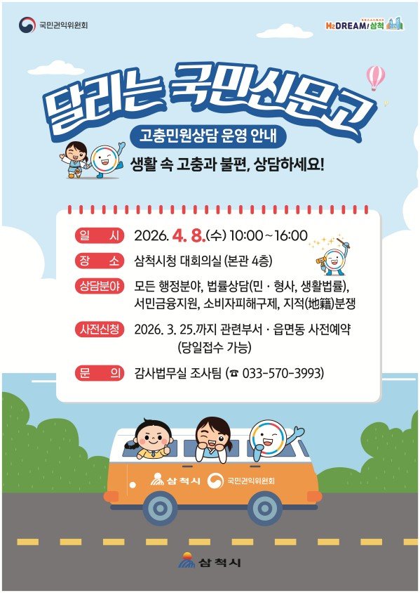 [아시아월드뉴스] 삼척시가 4월 8일 오전 10시부터 오후 4시까지 시청 본관 대회의실에서 국민권익위원회와 함께 ‘달리는 국민신문고’를 운영한다.