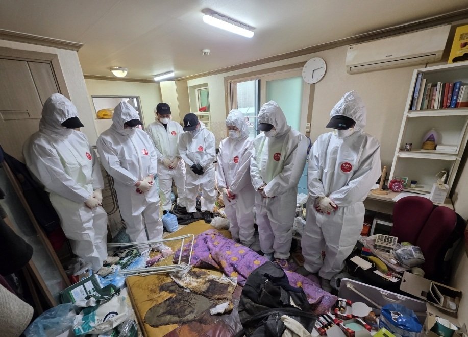 이날 봉사자들은 악취로 인해 힘든 상황에서도 망자에 대한 애도의 마음을 가지고 경건하게 활동에 참여했다.