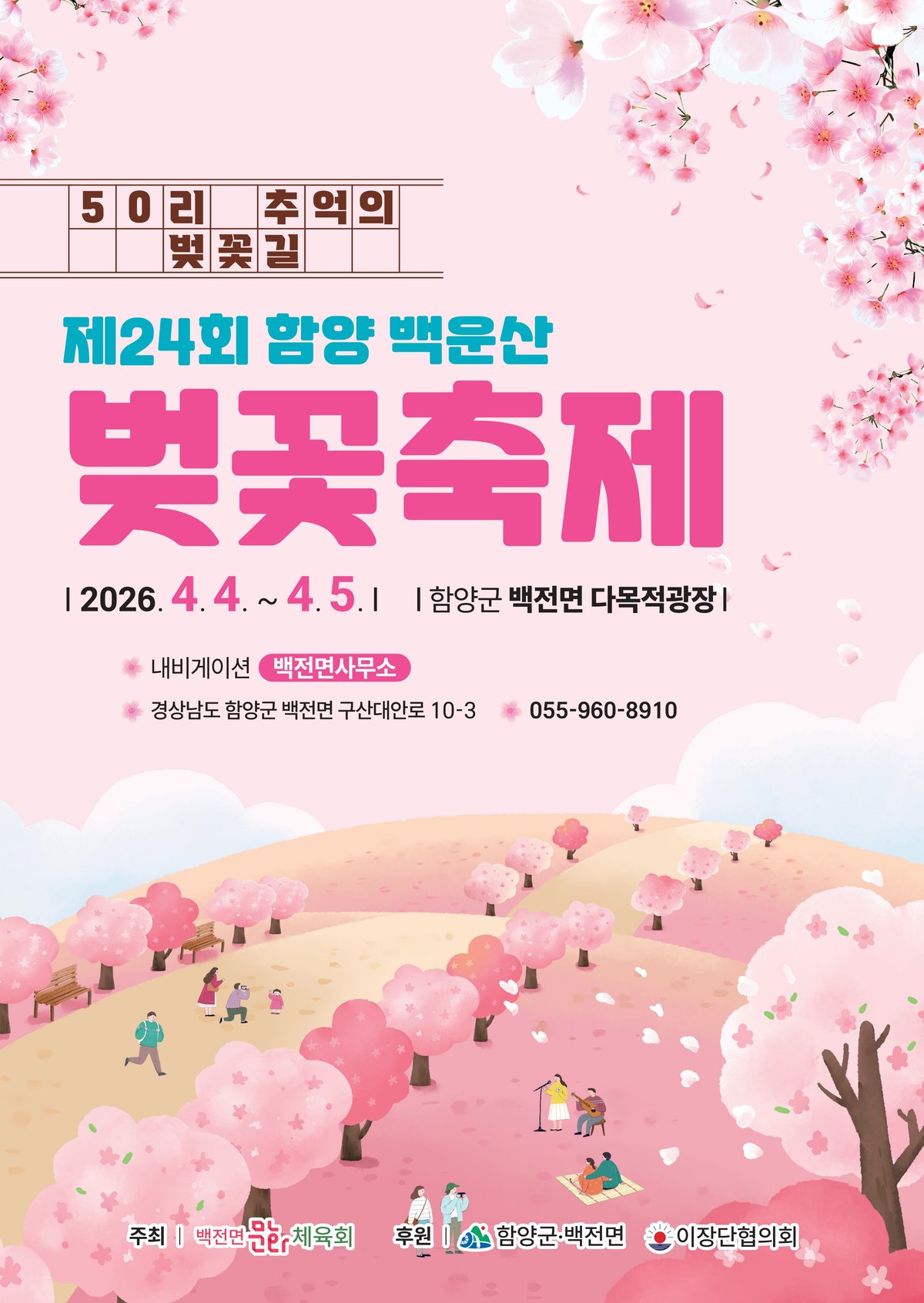 [아시아월드뉴스] 함양군은 '제24회 함양 백운산 벚꽃축제'가 오는 4월 4일부터 5일까지 이틀간 백전면 다목적광장 일원에서 개최된다고 밝혔다.